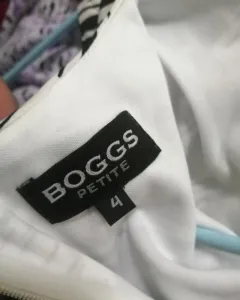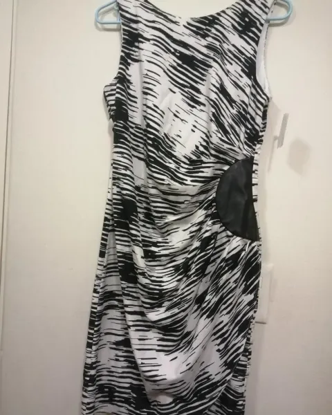 Vestido asimétrico blanco y negro, cin detalle en cintura de vinil, talla 4 petitte, nuevo con etiqueta
