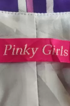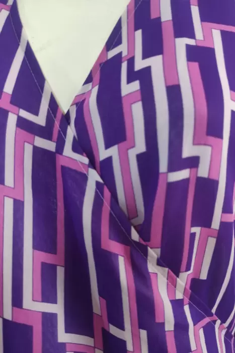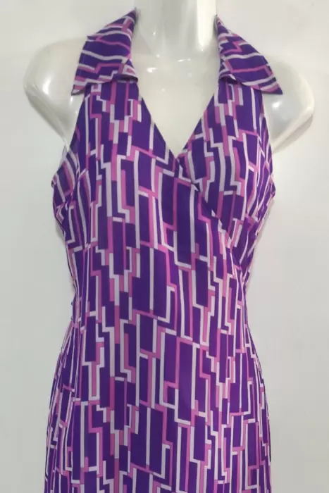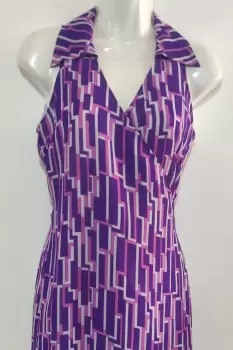 Vestido Pinky Girls. Vestido morado con formas cuadradas en estilo retro-futurista. Los cordones pasan por adentro en la parte derecha del vestido para que al ajustar dejen una abertura en la pierna.