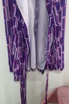 Vestido morado con formas cuadradas en estilo retro-futurista. Los cordones pasan por adentro en la parte derecha del vestido para que al ajustar dejen una abertura en la pierna.