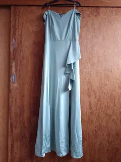 Vestido pistache con abertura. La prenda es color pistache, un color hermoso que combina excelente con el tipo de tela que es satinada. Hace una excelente figura porque ciñe un poco la cintura y tiene un vuelo en una pierna con una apertura. Es de hombros descubiertos y es súper cómodo. Es talla L-XL.