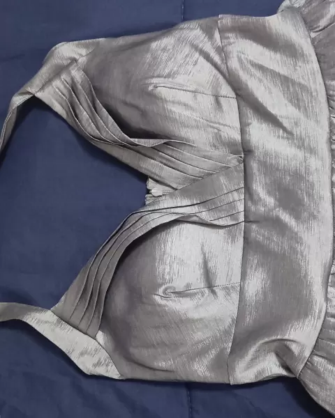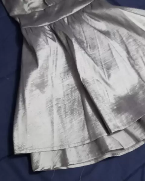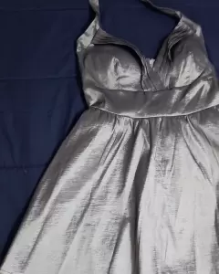 Bonito vestido color plata, para eventos de nocheQueda super lindo es a la altura de la rodillaLa tela es un poco brillosaNo se transparenta .Cuenta con fondoSujeto a Ofertas