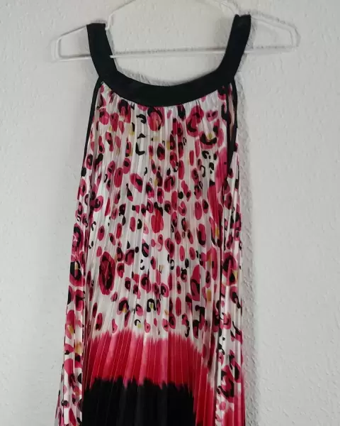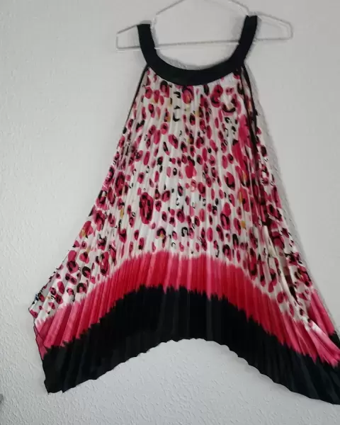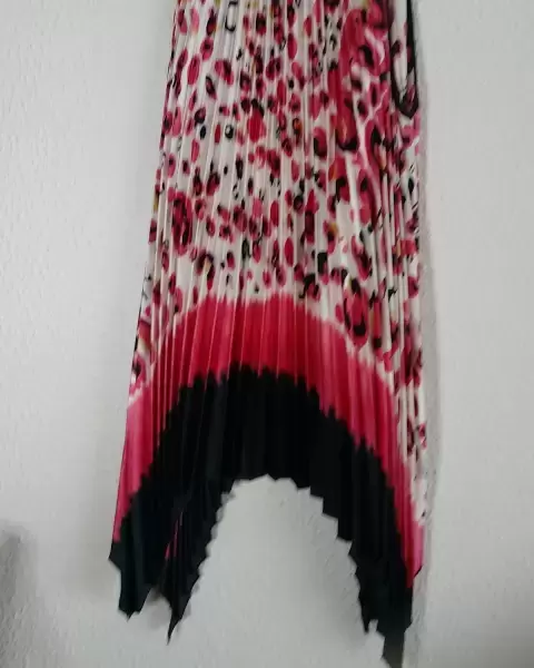 Vestido muy colorido, plizado, asimétrico, muy eleganteLargo de los costados y mas corto del frente y de la parte de atrás Ideal para una fiesta casual, una comida formal o la oficina