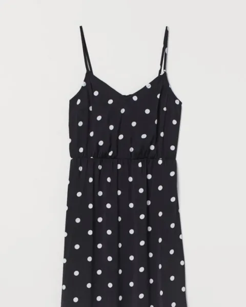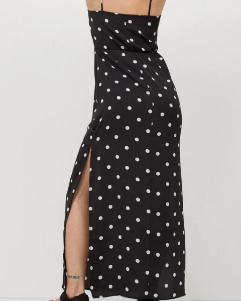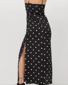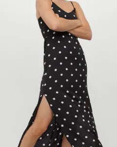 Vestido largo, estilo polca dots. Tiene aberturas en la parte media baja del vestido de ambos lados. En la cintura trae elástico