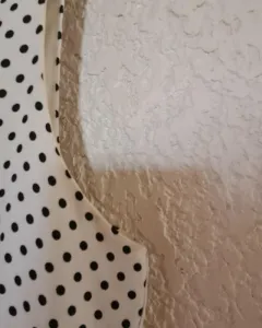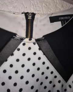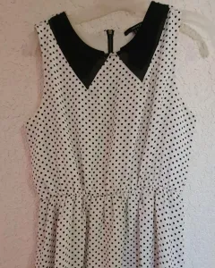 Vestido color blanco con puntos negros y lindo cuello, sin mangas. Cintura 70 cm pero tiene resorte, se ajusta, pecho 90 cm corte arriba de la rodilla
