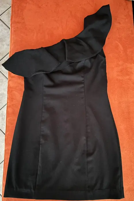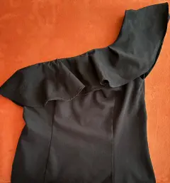 Vestido negro con un solo hombro, con bonito holán, que enmarca el talle, corto