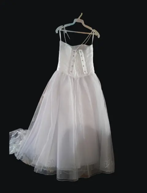 Vestido blanco corte strapless, y tipo corsette con tela tipo organza y costura en punta, talla 10