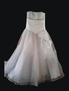 Vestido primera comunión. Vestido blanco corte strapless, y tipo corsette con tela tipo organza y costura en punta, talla 10