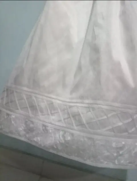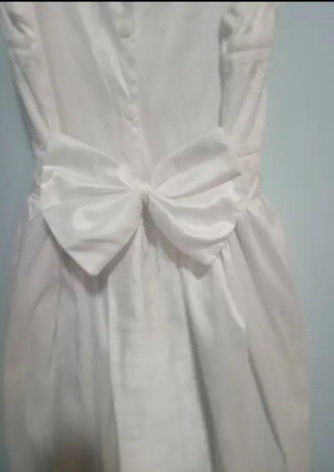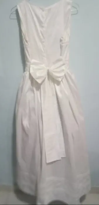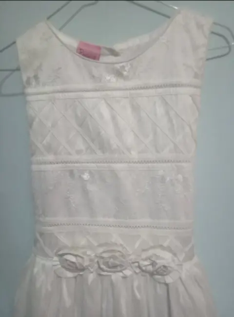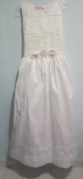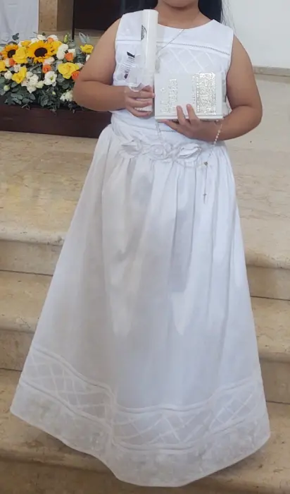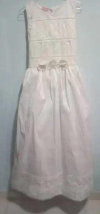 Hermoso vestido para primera comunión, color blanco, talla 16, usado solo en misa, con bello detalle en la orilla de la falda. Trae faldilla de tul integrada. Sin detalles. Al frente trae tres flores que se quitan y ponen en la cintura, dándole una bonita vista