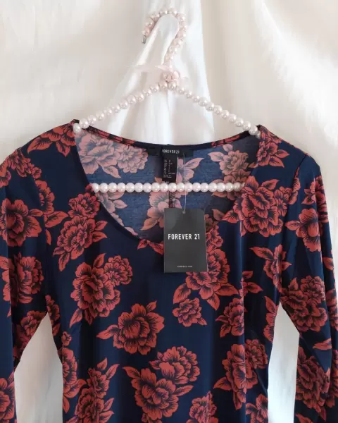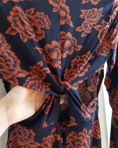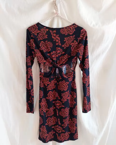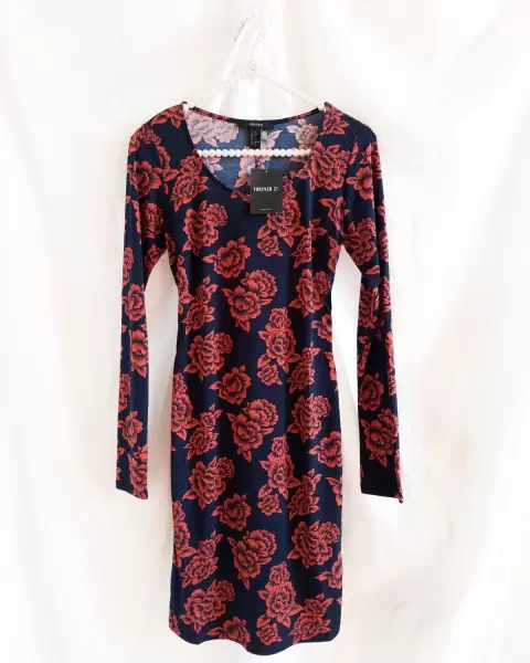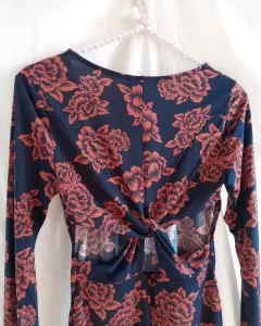 Vestido print flores. Tela tipo licra (estira bastante) la parte de atrás tiene una abertura cruzada super padre(precio en tienda $699)Color chedron con flores azul marino