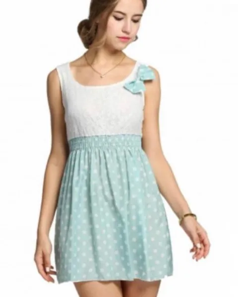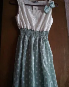 Vestido puntos. Vestido blanco con resorte falda verde con puntos blancos. Nota: El vestido podría necesitar fondo debido a que se puede transparentar.