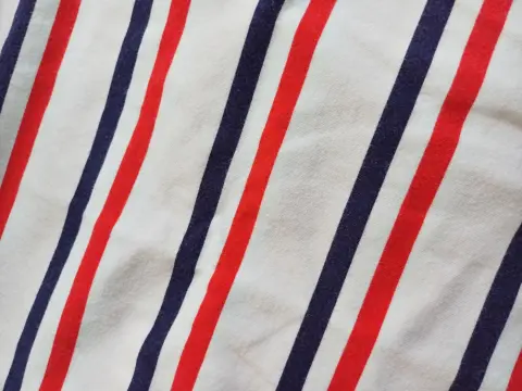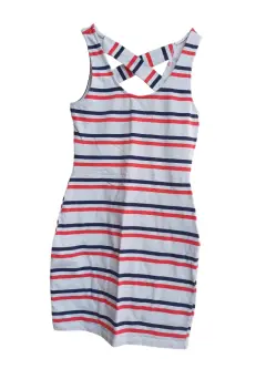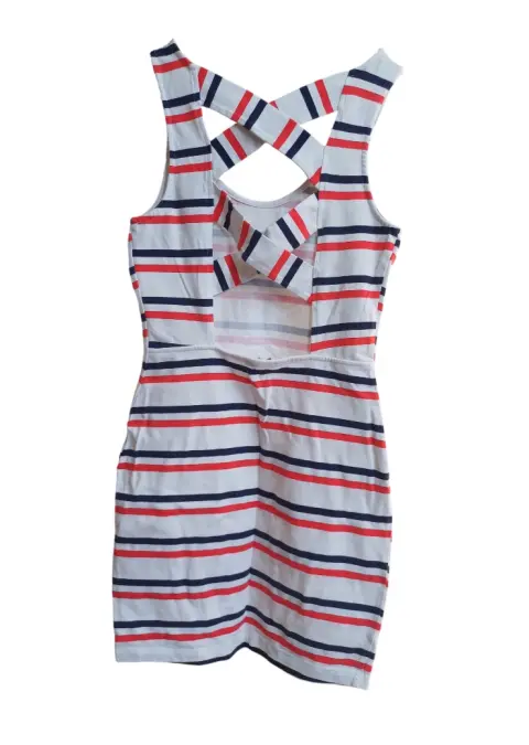 Vestido corto, ajustado, la tela estira, sin mangas, con cuello redonda y apertura en la espalda, color blanco con líneas horizontales color rojo y azul marino, talla chica (s) marca Charlotte Russe, completamente nuevo