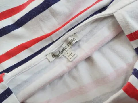 Vestido rayado. Vestido corto, ajustado, la tela estira, sin mangas, con cuello redonda y apertura en la espalda, color blanco con líneas horizontales color rojo y azul marino, talla chica (s) marca Charlotte Russe, completamente nuevo