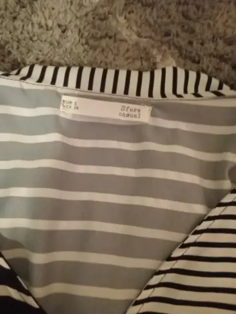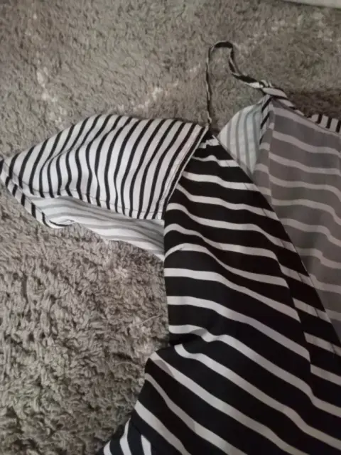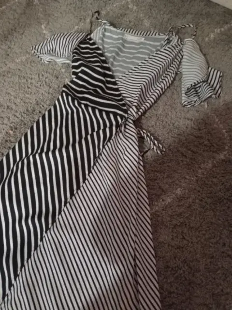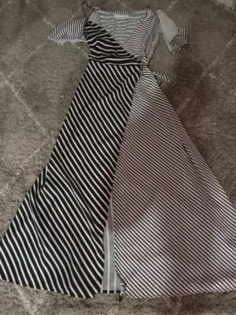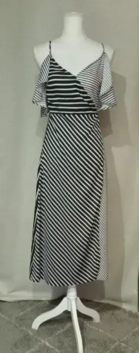 Hermoso vestido con rayas disparejas color blanco con negro. De tirantes. Los tirantes no son ajustables. Tienen cinta en cintura para ajustar. La tela es delgadita y ligerita. Medidas ax a ax 41 cm, cintura 37 cm, largo 123 cm.