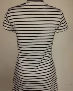 Vestido holgadoRayas blanco azul marinoDetalla en el escoteManga cortaArriba de la rodilla