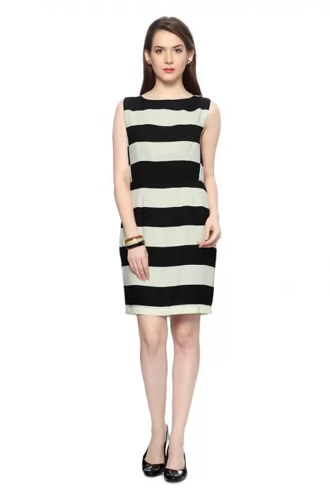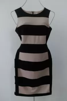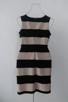 Hermoso y fino vestido de rayas horizontales en color beige y negro marca Calvin Klein. Diseño en corte semi ajustado a tu figura, con cintura marcada y sin mangas. Con cierre en espalda. Hecho de tela gruesa ajustable. Sin forro.Tela: 77% poliéster, 20% rayón y 3% espandexTalla 6. ChicaMedidasPecho 94 cm ajusta hasta 100 cmCintura 84 cm ajusta hasta 95 cmCadera 100 cmLargo desde hombros 93 cmEn perfecto estado. Sin detalles