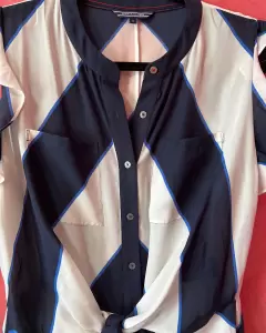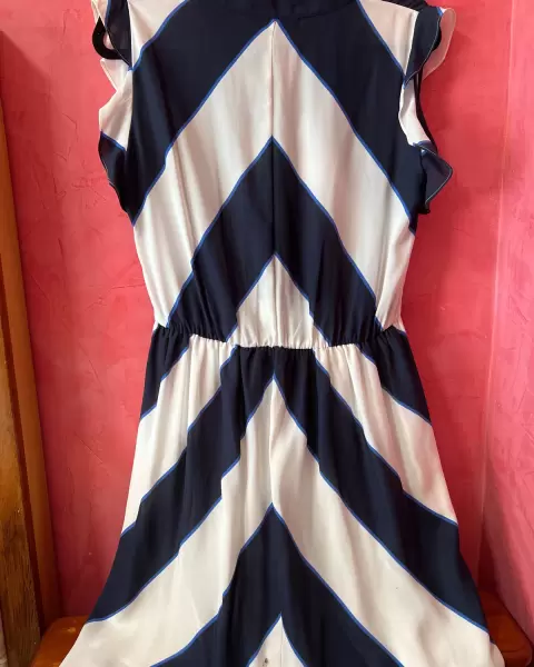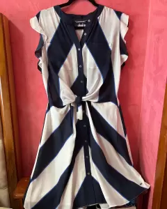 Vestido rayas encintradas. Vestido de rayas encontradas con botones al frente y cinta de ajuste en la cintura, con Olán alrededor de la manga