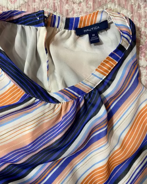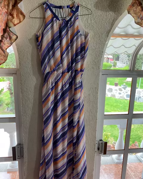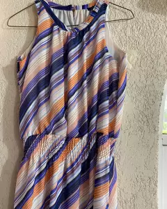 Vestido rayas fiesta Nautica. Vestido multicolor, tiene un resorte en la cintura para hacer figura, de largo es a la pantorrilla, moldea muy bien al cuerpo, tiene un botón para abrochar en el cuello, tiene un fondo blanco que ayuda a que no se transparente