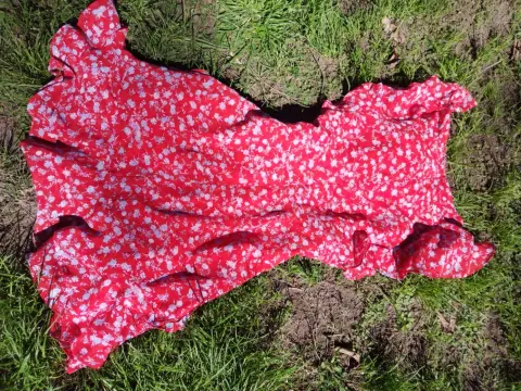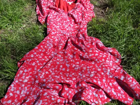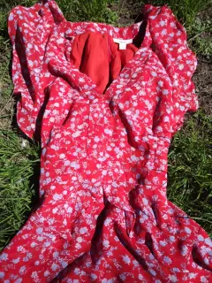 Vestido rojo. Vestido rojo floreado con el color de las flores azul cielo no tiene ningún detalle
