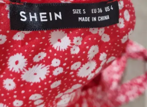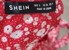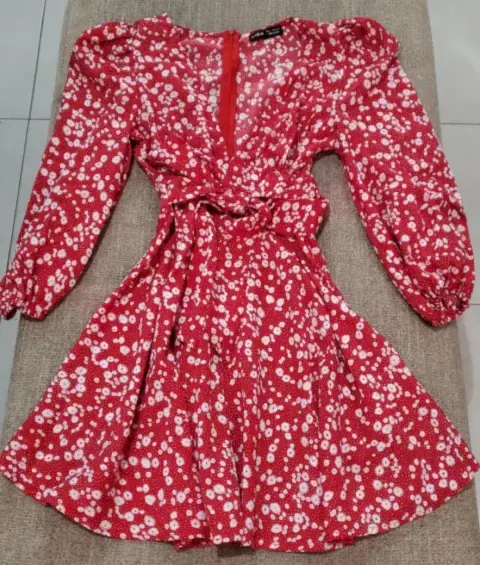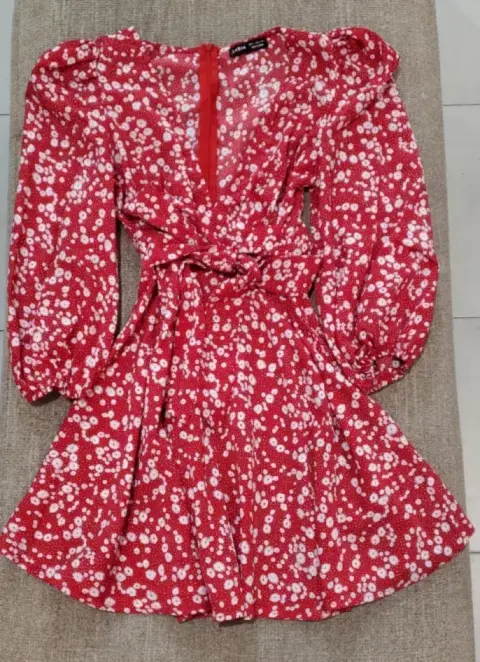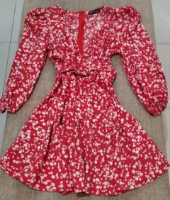 Vestido corto talla S, volado, rojo brillante con detalles en blanco, escote en V pronunciado, con listones para ajustar a la cintura, tela delgada pero no transparenta.