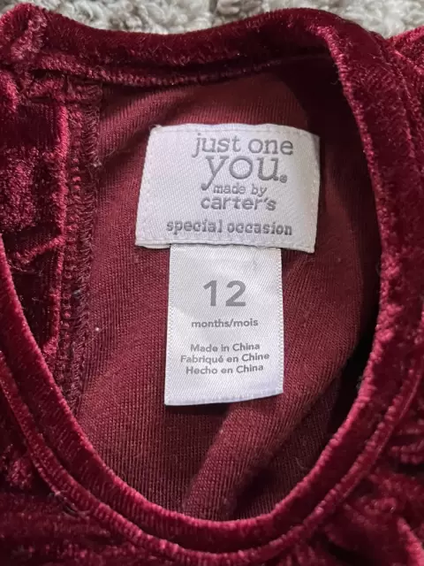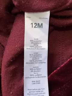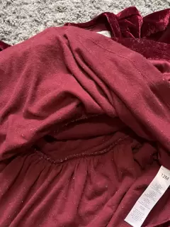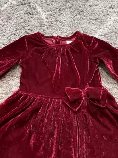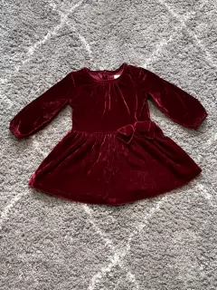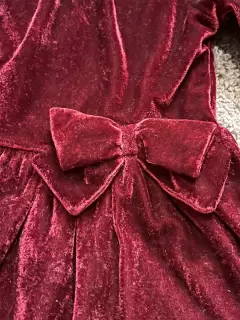 Hermoso vestido rojo de terciopelo. Tiene un moñito enfrente. Por fuera está en excelente estado, pero por la parte de adentro tiene bolitas por el uso. No afecta la estética por fuera. Talla 12 meses