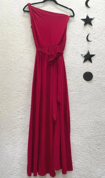 Bonito vestido color rojo de un hombro, con una abertura en la pierna izquierda y un lazo en la cintura.
