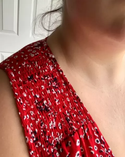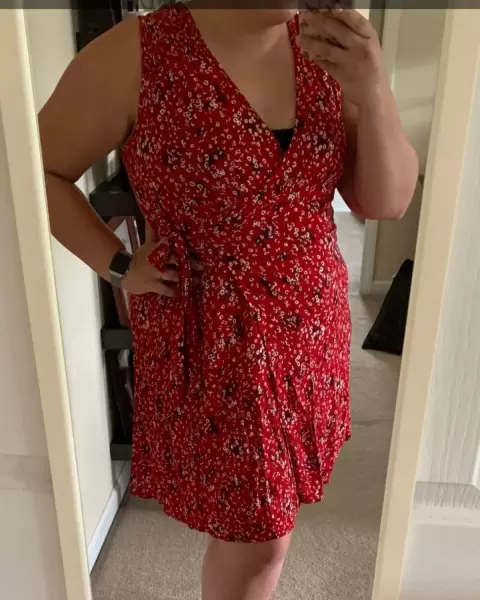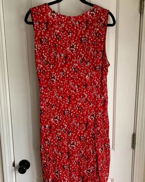 Vestiso rojo con estampado pareciera de flores en color negro, sin botones ni cierres. Se amarrra con una cinta cruzando el vestido. Super fresco y primaveral