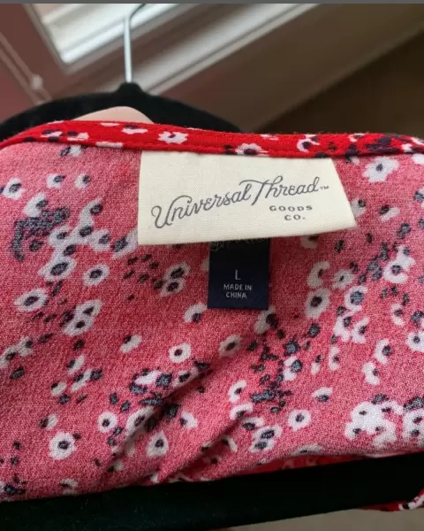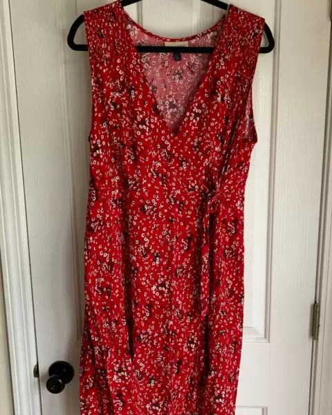 Vestido rojo de Universal Thread. Vestiso rojo con estampado pareciera de flores en color negro, sin botones ni cierres. Se amarrra con una cinta cruzando el vestido. Super fresco y primaveral