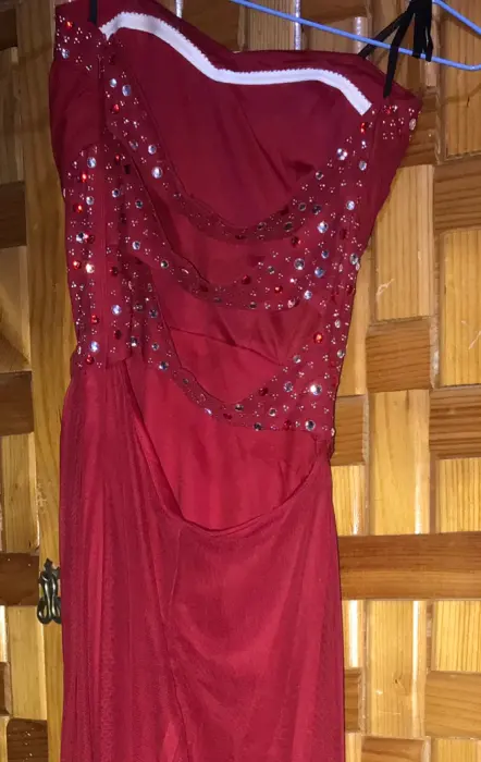 Vestido rojo elegante. Bellísimo vestido largo color rojo con detalles de pedrería en la espalda