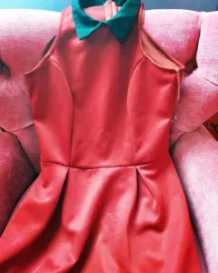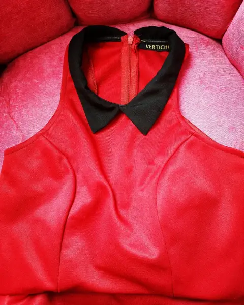 Vestido color rojo, con cuello negro, formal, talla chica, es cortl, llega a la rodilla o un poco arriba de ella