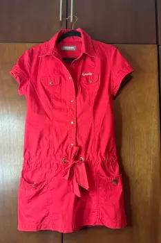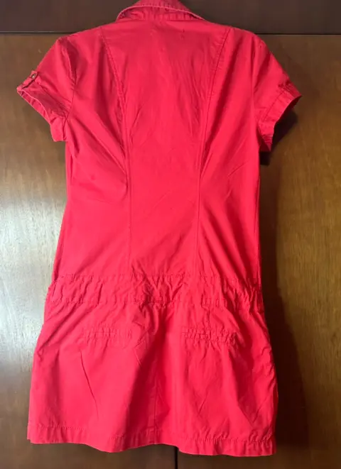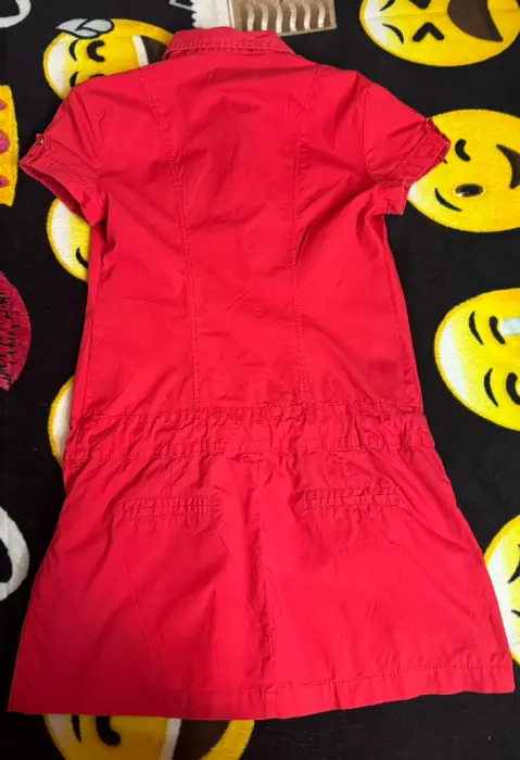 Vestido rojo corto, con botones para cerrar enfrente, ajustable en la cintura, bolsas enfrente, manga corta, Talla: Grande un poco reducido,de uso.
