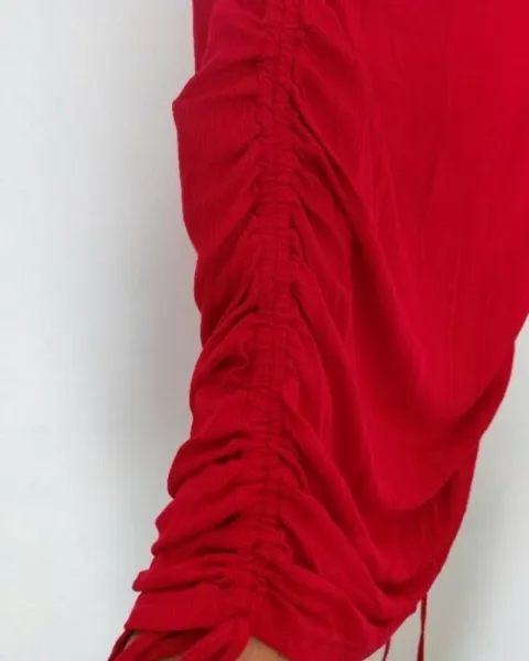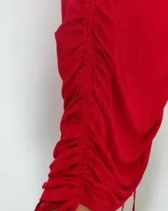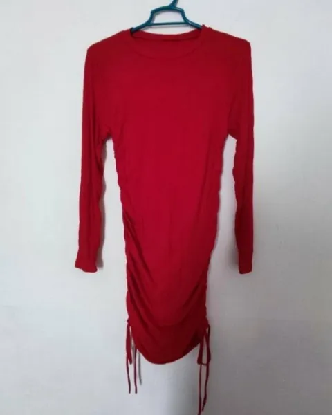 Hermoso vestido rojo, manga larga; tiene lado a los lados para fruncir y elegir el largo. La tela es delgada pero de transparenta muy poco (con la ropa interior adecuada se verá súper) Lo compre en Aliexpress por lo que no tiene etiqueta.Jamás lo usé, no tiene detalle.