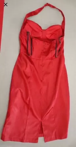 Vestido tipo satin rojo escote de corazón, con tirante en el cuello espalda descubierta, simulación de moño en el escote. Muy lindo y sexy