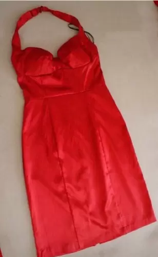 Vestido rojo tipo satin con tirante cuello Talla S. Vestido tipo satin rojo escote de corazón, con tirante en el cuello espalda descubierta, simulación de moño en el escote. Muy lindo y sexy