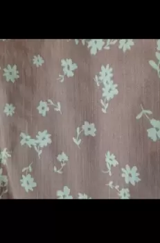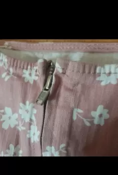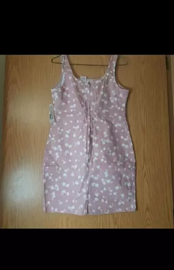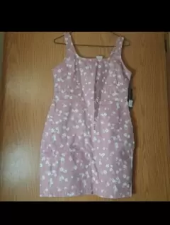 Vestido tono rosa con estampado de flores blancas, con cierre por la parte de adelan, tetextura tipo mezclilla, completamente nuevo con etiqueta talla M.