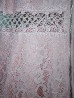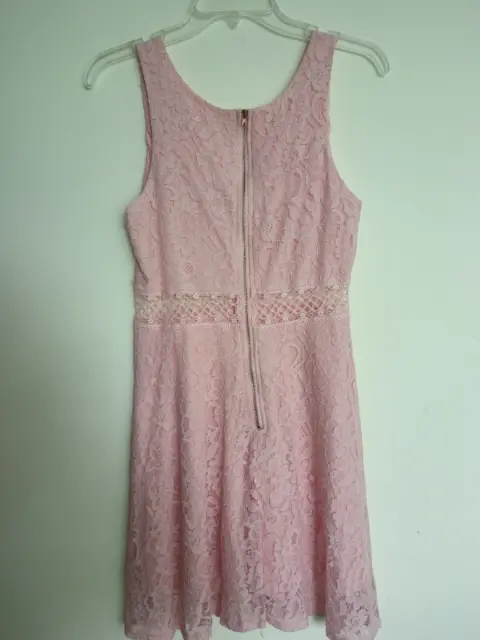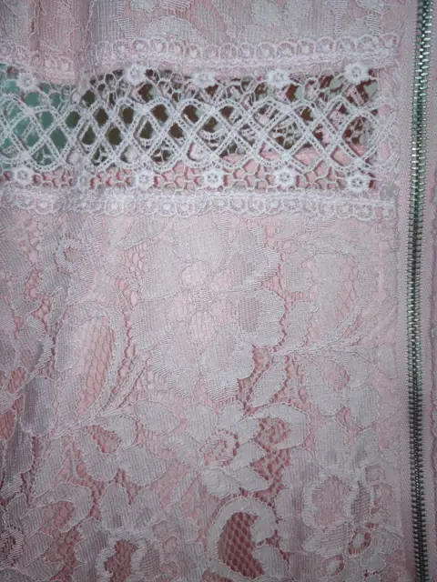Vestido color rosa corto con encaje de flores del mismo color cierren buenas condiciones color plata en la parte posterior sin mangas y cuenta con una apertura en la parte media