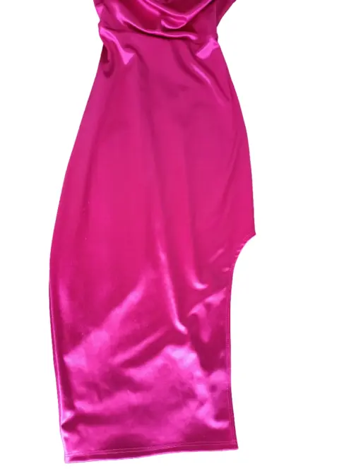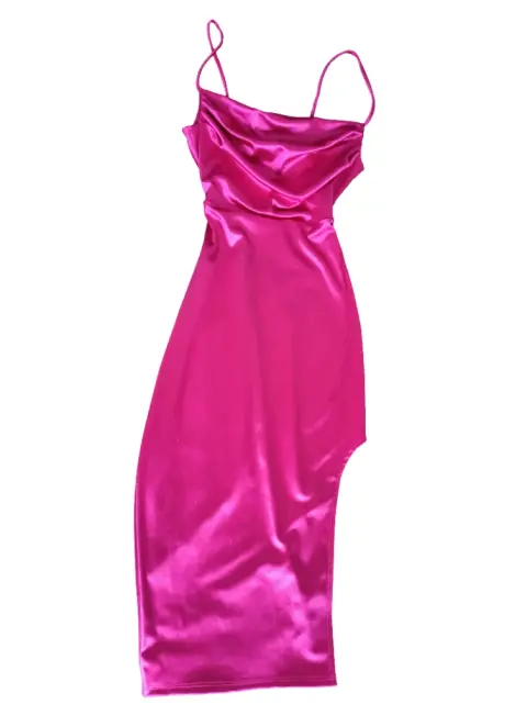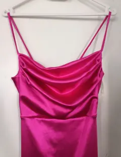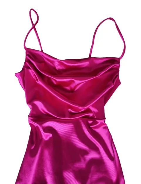 Vestido rosa de satín. Vestido elegante de satín, color fushia. Talla S. En excelente estado, solo fue puesto una vez por unas horas. Tirantes delgados, tela cómoda, abertura en la pierna.