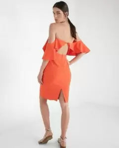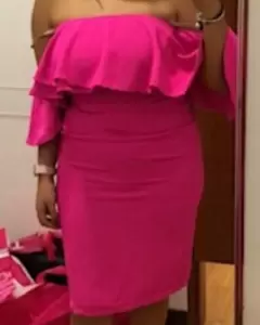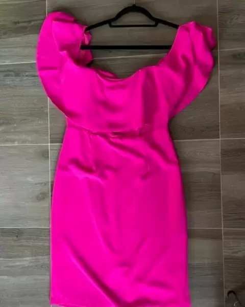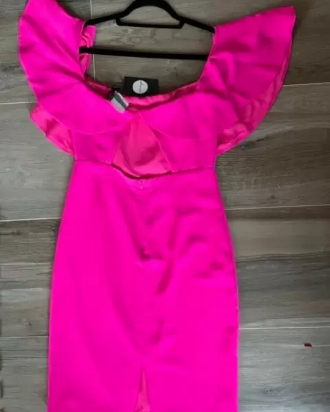 Vestido rosa, hombros descubiertos. Vestido rosa fosfo 3/4, hombros caídos, con abertura pequeña en la espalda, Nuevo.