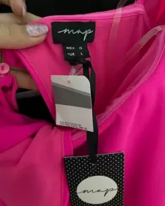 Vestido rosa fosfo 3/4, hombros caídos, con abertura pequeña en la espalda, Nuevo.