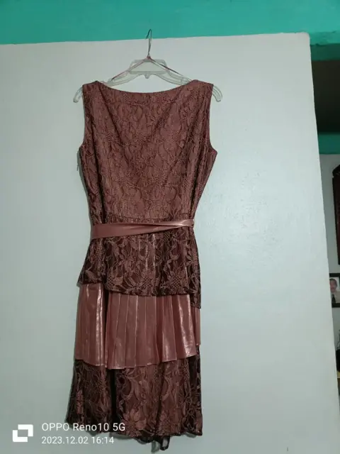 Vestido Rosa Viejo. Lindo vestido tipo cocktail/fiesta en encaje y tela tipo satín. Con cierre para ajuste y cinta para la cintura (no tiene de un lado un hojal para la cinta).Talla 13/34