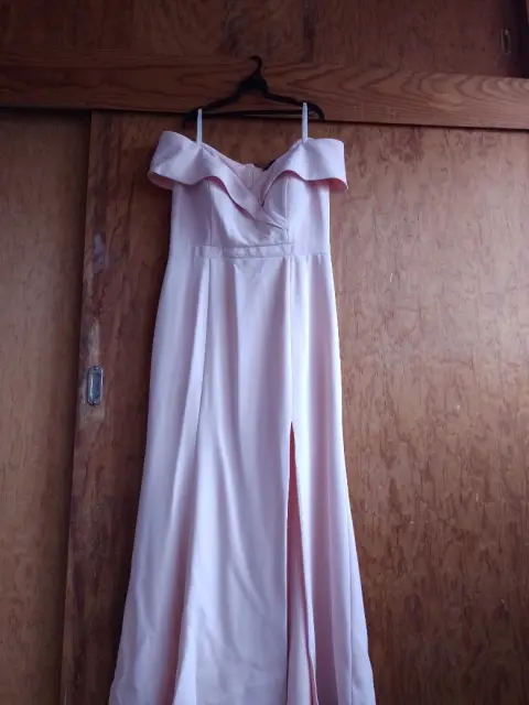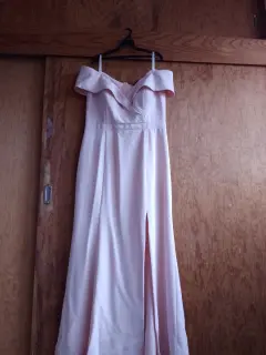 Vestido rosado con abertura. El vestido tiene los hombros descubiertos, las mangas quedan por los brazos. Tiene un corte sirena y una abertura en la pierna izquierda. Es todo liso y crea una figura excelente. También tiene una poco de cola.Es talla L-XL