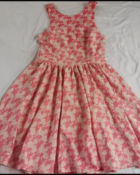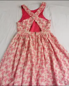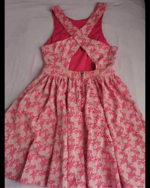 Vestido rosado con espalda cruzada. Hermoso vestido marca shasa talla chica, color rosado, está impecable, no tiene ningún defecto, el cierre está muy bueno también, queda muy bello puesto, arma muy bien, mide 66 de cintura y 83 de largo