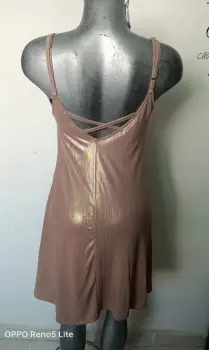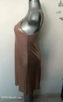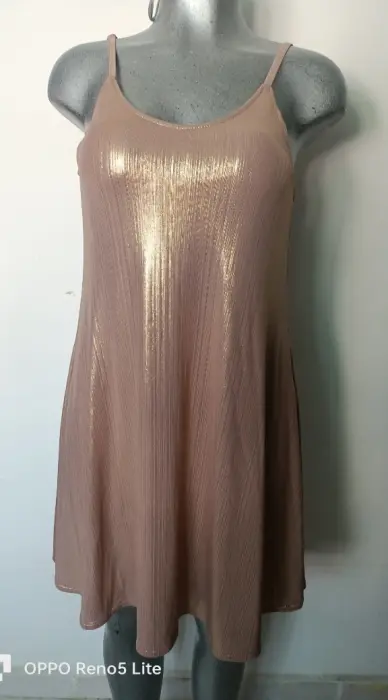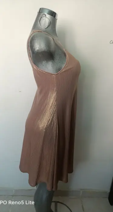 Hermoso vestido con vueloTiene forroUnitallaEs un color oro nacarado Nuevo da a una talla g