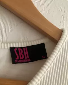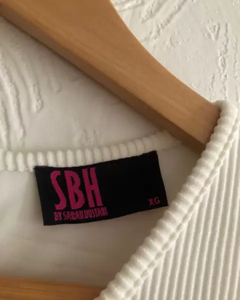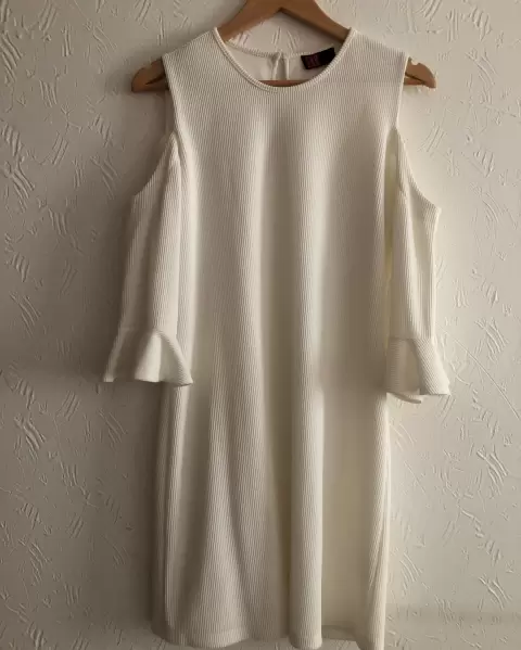 Hermoso vestido SBH by Sarah Bustani, blanco con hombros descubiertos y manguitas 3/4. Cuenta con un fondo para que no se transparente, esta hermoso y es muy cómodo, se puede usar con tenis o tacones, luce padrisimo. No tiene ningun detalle porque esta nuevo solo no trae la etiqueta. Talla XL