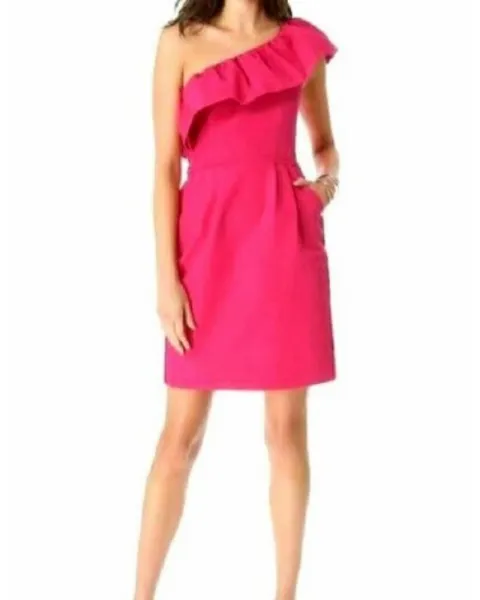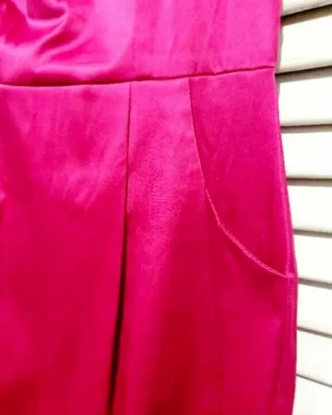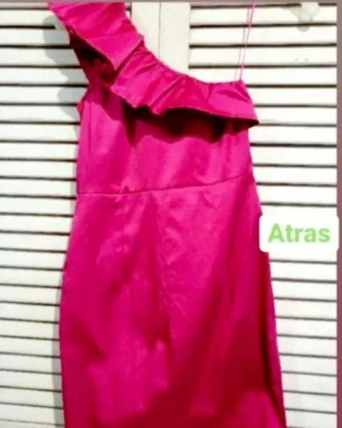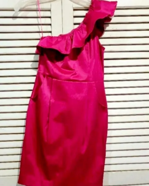 Lindo vestido de tela satinada rosa mexicano, de un solo hombro, bolsas en ambos lados.muy lindo y vestidor!!