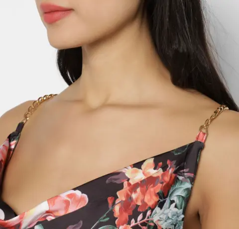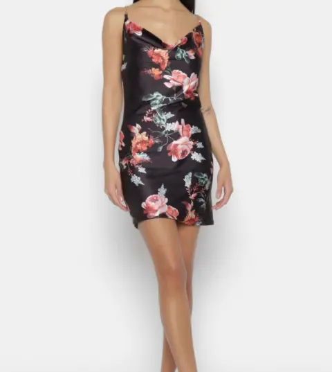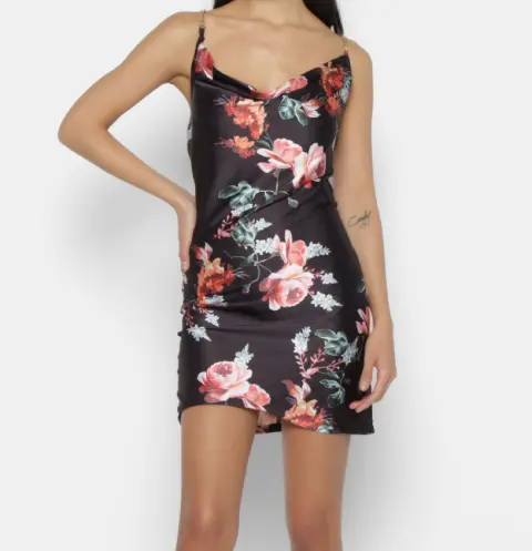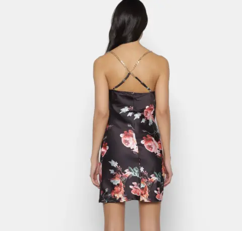 Hermoso vestido satinado color negro con estampado de flores, tirantes de cadenas color dorado talla chica marca Guess, da hasta talla mediana