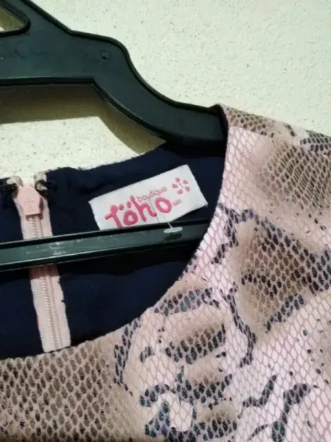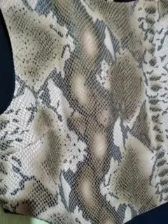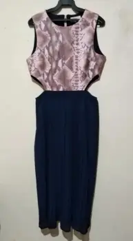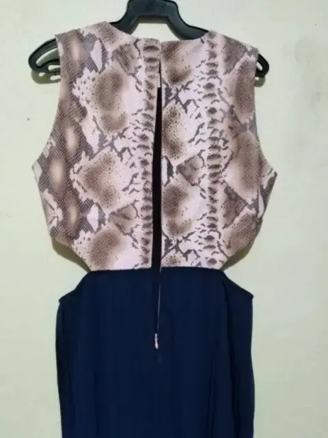 Vestido super fresco y cómodo, parte de arriba es piel de serpiente color rosa, parte de abajo falda color azul oscuro tela transparente con fondo por debajo, aberturas a la altura de la cintura.