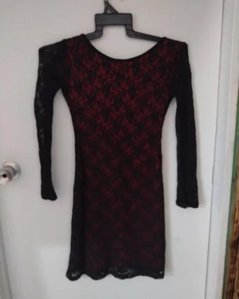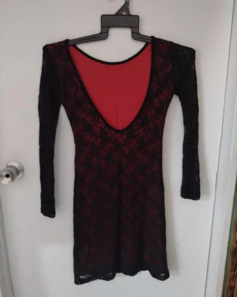 Hermoso vestido de la marca Viky forma muy sexi en la parte de atrás trae un escote que asé que buscas tu espalda es corto a las rodillas con transferencia en las mangas largas trae una tela transparente arriba y por la parte de abajo un forro en color rojo que lo asé ver sexi y atrevido está lindísimo para usar en cualquier momento.