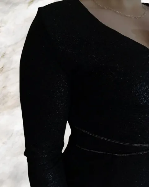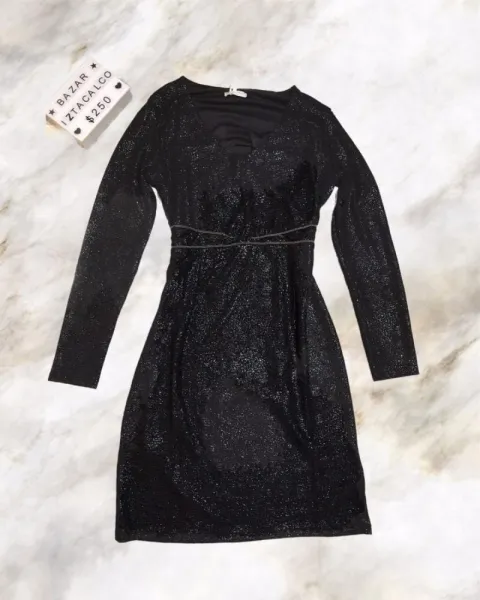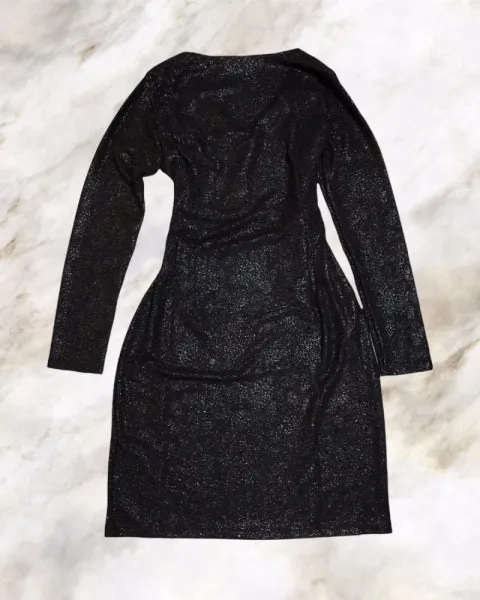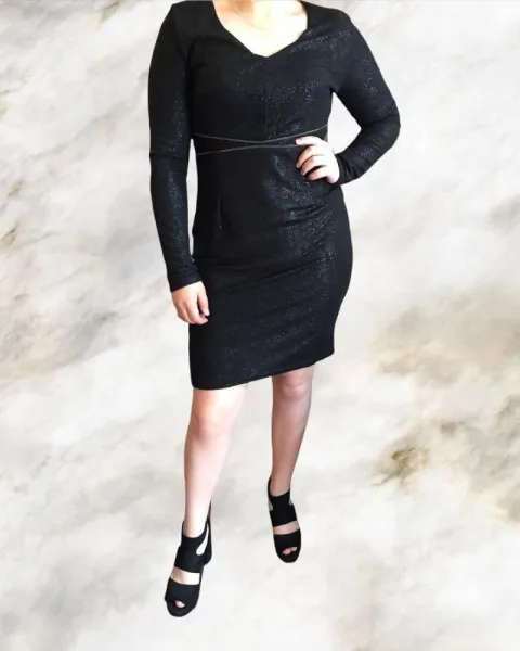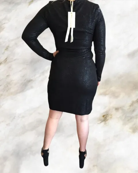 Vestido para dama escote en v y manga larga, ase ajusta al cuerpo de una forma elegante y sexy. Llega hasta arriba de la rodilla trae un tipo cierre al frente como decoración y el cierre en un costado debajo del brazo izquierdo. Color negro brillante. Tres forro delgado por dentro