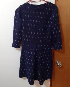 Lindo vestido corto azul marino, con begoña y blanco. Tiene un pliegue en el frente. Usado, pero en buen estado. Talla S. Medidas:hombro a hombro:36 cm, axila a axila: 41 cm y largo de 80 cm.