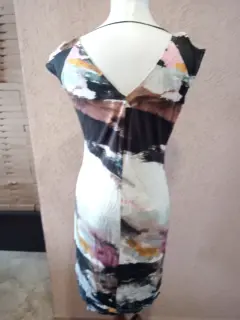 Vestido silueta ajustada. Excelente vestido fresco para la temporada de calor Composición 91% viscosa 6% elastano, forro 100% poliéster.Medidas hombros 45 cm, de axila a axila 46 cm, cintura 76 cm, cadera 92 cm, largo 93 cm